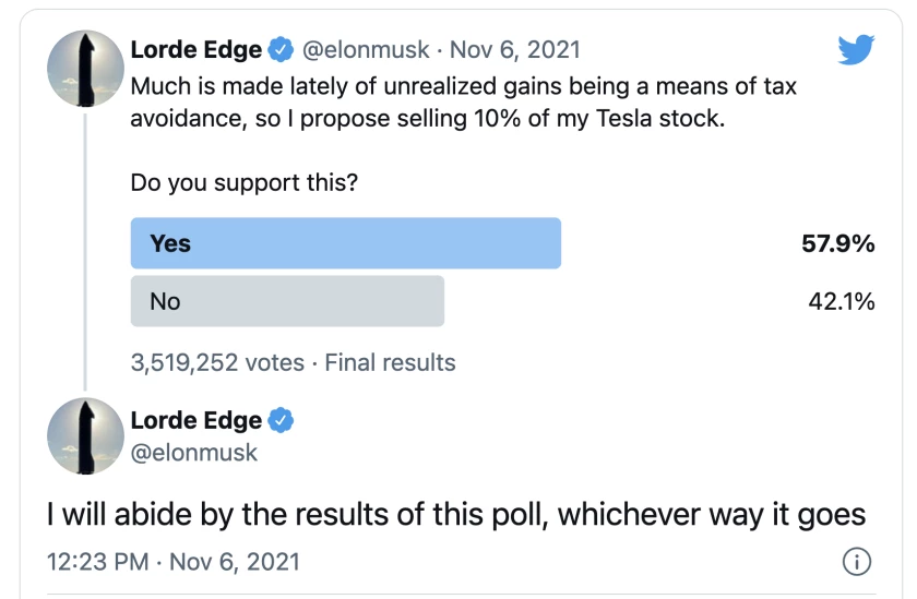 Musk, moreover, may have reason to pare down his Tesla holdings unrelated to the Twitter vote. For one thing, Tesla shares are riding at record levels just now, so it might make sense for him to cash out at least some of them while the getting is good. Further, he actually does face what looks like an inescapable tax bill next year, when Musk exercises the options on 73.5 million shares.